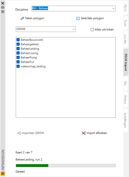 Je ziet de import in de tekening binnenkomen en de status van de import is veel duidelijker gemaakt met tekst en voortgangsbalk. Ook kun je grotere gebieden selecteren dan voorheen. Mocht het te lang duren, dan kan de import afgebroken worden.