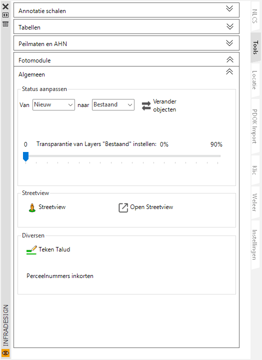 Je kunt voortaan Infradesign opstarten in BricsCAD en die op meerdere tekeningen gebruiken. Dit maakt Infradesign intuïtiever. De namen van de tabs zijn iets aangepast.
